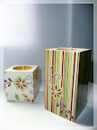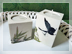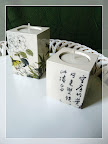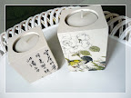 Dorzucam zatem parę świeczników, które zrobiłam dla mojej koleżanki Joli. Jola sama wygrzebała z moich zbiorów serwetkę, która została wykorzystana do ich ozdobienia. Można powiedzieć, że są nieco w orientalnym stylu. Oto one: