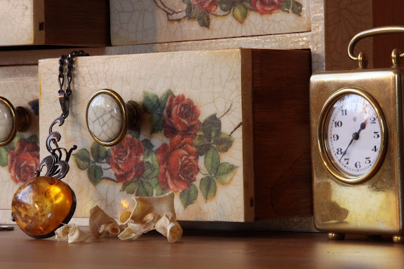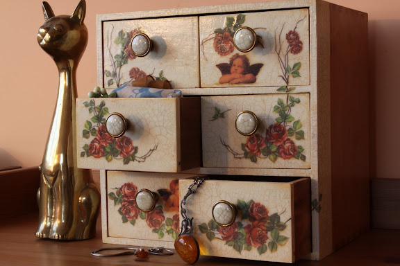 Komódka - rzecz gustu, miałam zadany temat przez sasiadkę - róże. Za bardzo różana wtedy nie byłam, ale dzięki tej komódce róże polubiłam. Natomiast rozumiem, że niektórzy mogą mieć już dosyć róż i aniołków. Na szczęście sąsiadka jest wniebowzięta.