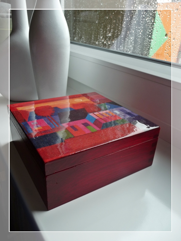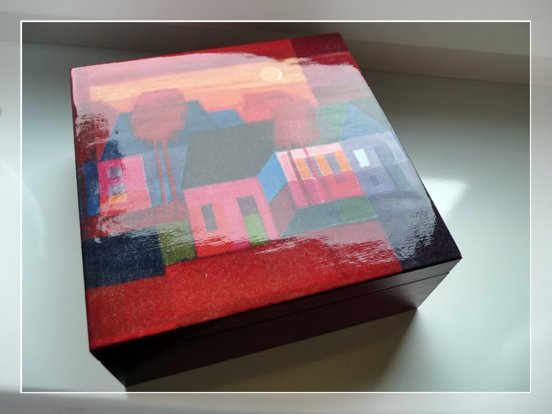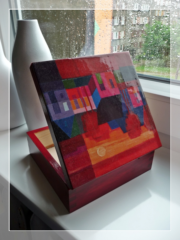 Dziś mam przyjemność zaprezentować pracę, w której wykorzystałam jedną z nich. Nie jest to nic wielkiego – taka oto sobie skromna skrzyneczka na biżuterię, ale ten motyw na wieczku to jest dla mnie coś! Ta skrzynka miała być dla mnie, ale spodobała się mojej instruktorce z "Klubu Malarskiego" i powędrowała do niej.